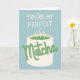 Ce design moderne et minimaliste de thé vert matcha présente un jeu de mots mignon et drôle sur les mots 'tu es mon parfait accord'. Ce design amusant sur le thème de la nourriture peut être utilisé pour un anniversaire ou la Saint-Valentin pour vos proches, partenaire, petit ami ou petite amie et utilise des couleurs bleues et vertes.