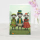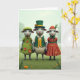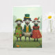Cette carte montre trois moutons anthropomorphes debout les uns contre les autres dans un paysage campagnard doux, leurs épaules se touchant presque comme s'ils partageaient une plaisanterie privée 💚. Derrière eux, des champs verts se fondent dans des arbres lointains brumeux sous une lumière du jour douce, donnant au décor une apparence calme d'après-midi printanier. Le mouton à gauche porte une robe vert citron à pois orange-rouge et une casquette assortie ajustée, penché légèrement vers le centre. Le mouton du milieu, plus grand, semble vêtu avec soin d'une chemise blanche avec un gilet jaune vif et un gilet émeraude foncé, surmonté d'un chapeau haut décoré d'un tournesol orange ☘️. Sur la droite, le troisième mouton porte une robe en terre cuite parsemée de petites fleurettes jaunes et vertes et un chapeau rouge avec une petite brindille verte, souriant aux autres avec de grands yeux sombres. Tout texte est situé près du haut dans une couleur vert moyen, laissant le trio comme point de mire en dessous.