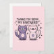 Célébrez votre lien spécial avec cette carte fantaisiste "Merci d'être mon partenaire" ! Avec deux chats de dessin animé adorables, ce design ludique est parfait pour exprimer votre appréciation lors des anniversaires, de la Saint-Valentin ou simplement pour égayer la journée de quelqu'un. Partagez un rire et faites savoir à vos proches combien ils comptent pour vous avec cette carte charmante et amusante !