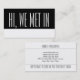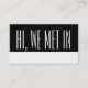 Restez en contact avec les voyageurs, les hôtels, les voyagistes ; agences de voyages et nouveaux amis que vous rencontrez en voyage local ou à l'étranger avec ces cartes pratiques qui disent, Salut, nous nous sommes rencontrés, suivi par le pays ou la ville que vous avez visité. Le dos a vos coordonnées et leur demande de rester en contact et de vous envoyer leurs photos de l'excursion que vous avez entreprise ensemble. Fini les embrouillages de papier, vous pouvez maintenant échanger rapidement vos données personnelles et vous assurer que vos cartes se rappellent où vous vous êtes rencontrés. Amusant, cool, moderne et impressionnant