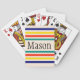 Ces cartes de jeu rayées audacieuses vintages personnalisables comportent des rayures d'image retournée aux nuances vibrantes du bleu de sarcelle d'hiver, de rouge, jaune et royal sur un arrière - plan crème. Il y a un espace entre les ensembles de rayures pour votre contact personnel. Remplacez simplement le texte existant par vos propres. Cette conception colorée est parfaite pour des explorateurs et des fashionistas de même. Le motif classique ne sortira jamais du style !