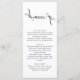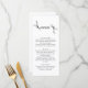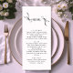 Ajoutez une élégance sans effort à vos tables de réception avec cette carte menu boho minimaliste, avec "Menu" dans un script délicat dessiné à la main et des champs entièrement personnalisables pour plus de détails. Le design noir et blanc, épuré, allie charme bohème organique et simplicité moderne, parfait pour les mariages rustiques, de jardin ou modernes.