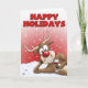 Une carte de voeux de Noël de bande dessinée avec une bande dessinée de Rudolph folâtrant un verre de vin dans un moment de selfie avec le texte "bonnes fêtes" au-dessus de lui. L'intérieur de la carte lit "vous souhaiter tout le meilleur cette saison des vacances."