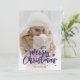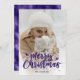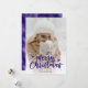 Cartes personnalisées de Noël violet avec une photo recouverte de neige et police en écriture manuscrite sur l'avant et faux papier mauve avec neige à l'arrière. Personnalisez facilement ces cartes de Noël violettes avec votre image et votre texte.