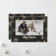 Belles cartes de Noël à double face noir et or avec des flocons de neige brillants et des étoiles avec un titre de calligraphie or et un cadre photo.