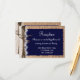 Cette carte de réception de mariage rustique est parfaite pour tout mariage champêtre. Elle présente un fond toile de jute imprimée rustique avec de la dentelle imprimée et de la ficelle sur le côté. Le lettrage est sur un rectangle bleu marine avec des bords effilochés. Parfait pour un mariage champêtre ou dans une grange. La toile de jute, la ficelle et la dentelle sont juste des motifs imprimés. Il ne s'agit pas de toile de jute, de dentelle ou de ficelle réels.