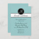 Cartes de réception de mariage simples et élégantes avec monogramme, avec un fond bleu clair, un monogramme initial blanc sur une étiquette noire et les noms des mariés sur une bande noire et blanche. Personnalisez avec les informations de votre réception de mariage, les noms du monogramme et les couleurs de votre mariage en utilisant les invites de menu faciles à utiliser de Zazzle. Par Elke Clarke© pour Monogram Gallery.