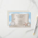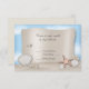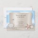 Elégante carte-réponse pour un mariage sur le thème de la plage avec coquillages, dollars de sable, étoile de mer et message, sur un ciel bleu.