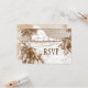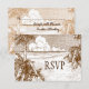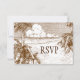 Un modèle de carte de réponse à l'eau-forte de plage tropicale modifiable avec des lettres scriptes et serif sur une gravure vintage de palmiers bruns sur une plage de sable et de beaux nuages sur des vagues océaniques calmes, et un espace pour votre réponse et les dates au verso.