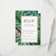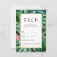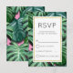 Une carte de réponse de mariage simple avec un fond peint mettant en vedette des feuilles tropicales peintes en vert. Un cadre blanc superposé avec une bordure en faux or.