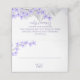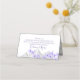 Carte de place violette lilas et chaîne de montagnes pour accueillir vos invités. Lavande et grise carte pliée de mariage de printemps avec ligne pour écrire les noms et le numéro de table et les noms personnalisés et le message à l'envers.