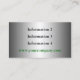 Une frontière en acier de chrome de regard en métal chic dans 3d est un carte de visite de regard audacieux et unique sur un arrière - plan lisse argenté de regard en métal. Facilement personnaliser avec votre propre information. Employez la police montrée, ou changez facilement le style de police et/ou la couleur verte et noire. La carte de regard professionnelle parfaite particulièrement pour des professions industrielles, de construction et de construction. Plus d'information peut être mise sur le dos sur le même arrière - plan argenté de regard en métal. Un carte de visite indestructible fort qui tient l'écart-type le repos.