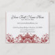 PALETTE DE COULEURS : rouge et blanc de baie de canneberge. COLLECTION DE CONCEPTION : Ceux-ci assortissent les télécartes d'affaires qui sont facilement customisées utilisant les gisements de modèle avec vos informations personnelles. C'est une collection orientée féminine véritablement élégante et sophistiquée d'affaires avec un talent vintage moderne formel ! Montré ici dans le blanc sur le noir, les cartes ont un aspect dramatique élégant. Pour une belle touche finale choisissez les articles assortis de papeterie de la même conception. C'est illustration conçue par Audrey Jeanne Roberts créé des éléments décoratifs de l'ornement de l'imprimante baroque de style gravée à l'eau-forte par cru antique qui ont été créés dans un motif de damassé. Les motifs gravés à l'eau-forte ont le feuille et les éléments aussi bien que le feuille floraux d'acanthe dans semi une forme de cercle d'étoile. Le fini toute la conception a une ère très victorienne ou une sensation française d'élégance à elle avec une torsion contemporaine. S'il y a un produit vous voudriez avoir créé qui ne nous est pas offert juste à message !