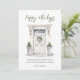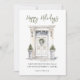 Image d'une porte d'entrée décorée de guirlandes de Noël avec un lettrage "Joyeuses Fêtes" en écriture moderne aquarelle.