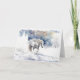 Un magnifique cheval blanc artistique avec une crinière flottante trottant à travers une scène hivernale enneigée. Une charmante carte de vœux de Noël qui utilise la technique de l'espace blanc pour améliorer l'attrait visuel de la scène.