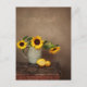 Envoyant des pensées de rétablissement ensoleillées avec une photo de style vintage de tournesols et de citrons sur une table de cuisine. Tons de Vermeer et des maîtres hollandais dans un style de peinture photographique moderne.