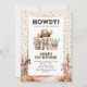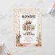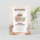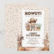 Cartes d'invitation d'anniversaire pour enfants sur le thème rustique western avec confettis de fête, décor de dessert avec des chevaux, un cowboy mignon aux cheveux noirs et un modèle de célébration moderne facile à personnaliser.