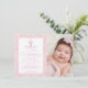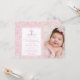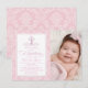 Cartes d'invitation de baptême damassé rose pour filles avec croix perle rose et écriture élégante sur un joli fond damassé rose bébé et place pour photo. Cette invitation de baptême damassée rose élégante est facilement personnalisable pour votre événement en ajoutant simplement vos détails dans le style de police et la couleur, et la formulation de votre choix.