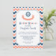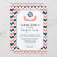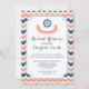 Nautique thème nuptiale invitation à la douche nuptiale en bleu marine foncé moderne, pêche orange rose et blanc chevron rayures motif avec roue de navire et bannière amusante.