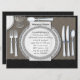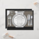 Joli modèle de carte d'invitation pour le dîner de répétition de mariage avec une nappe en damassé noir élégante et une assiette en porcelaine argentée. Vous pouvez facilement personnaliser cette invitation de dîner de répétition élégante avec les détails de votre événement dans le style de police, la couleur et la formulation de votre choix.