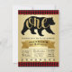 Cartes d'invitation pour le premier anniversaire de l'ourson bûcheron avec un ours noir et un 'UN' doré sur un fond à carreaux doré, noir et rouge. Cette invitation mignonne pour le premier anniversaire de l'ourson est facilement personnalisable en ajoutant simplement les détails de votre événement. Il s'agit d'une conception imprimée sans véritable paillettage.