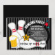 Commencez la fête d'anniversaire de votre garçon de la bonne façon avec notre invitation pour une fête d'anniversaire de bowling amusante avec une grande boule de bowling et des quilles sur un fond à rayures noires et grises avec des étoiles rouges, bleues et jaunes. Le verso de l'invitation est de couleur noire coordonnée. Entièrement personnalisable par vos soins avec vos informations. ©Babystar Designs