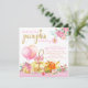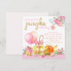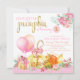 Cartes d'invitation pour le premier anniversaire de petite fille citrouille avec de jolies citrouilles et ballons roses, orange et or sur un fond à pois floral rose avec un texte mignon rose et or. Vous pouvez facilement personnaliser cette adorable invitation pour l'anniversaire de petite citrouille en ajoutant simplement vos coordonnées. Il s'agit d'un design imprimé sans véritable feuille métallique, rubans, etc.