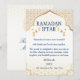 Partagez vos moments d'Iftar avec vos proches en utilisant ces magnifiques cartes, conçues pour ajouter une atmosphère chaleureuse et joyeuse à votre table de Ramadan. Ornées de motifs de croissant de lune et d'étoiles ainsi que de couleurs vibrantes de Ramadan, elles constituent une invitation charmante pour toute la famille et les amis.