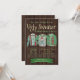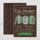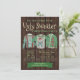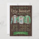 Carte d'invitation pour une fête de Noël au pull horrible avec trois pulls moches sur un fond en bois rustique. Vous pouvez facilement personnaliser ces invitations amusantes pour votre événement en ajoutant simplement vos coordonnées.