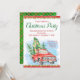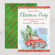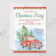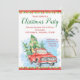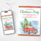 Cartes d'invitation de fête de Noël avec un camion vintage à l'aquarelle rouge et des arbres de Noël sur un fond festif de poinsettias rouges et verts.