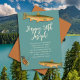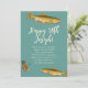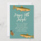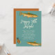 Cartes d'invitation pour l'anniversaire d'un homme adulte pêcheur. Design avec une truite mouchetée et un leurre de pêche à la mouche sur papier bleu-gris avec texte blanc cassé. Personnalisez facilement avec son nom, en script gras, en haut. Toutes les informations sur la fête sont ajoutées sous forme de paragraphe. Choisissez les options d'impression et/ou de téléchargement. Le verso est d'une couleur orange rouille uni.