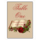 Un beau design d'une Bible ouverte en or avec de magnifiques Roses rouge vif décorant les bords. Ces cartes de numéro de tableau correspondent aux invitations de mariage du même nom