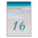 Voeux côtiers, cartes de numéro de table de mariage sur la plage. Ajoutez le numéro individuellement à chaque carte et il apparaîtra de chaque côté. Verticale avec scène de plage et eau tropicale turquoise de part et d'autre.