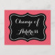 Cartes postales calligraphiées de changement d'adresse stylées. Couleur de fond personnalisée, c'est-à-dire rose corail. Cartes postales de déménagement avec motif de volutes ornementales. Texte de déménagement personnalisé ; Nous avons déménagé ! Nous avons déménagé ! Ajoutez votre nouvelle adresse au dos. Cartes de déménagement élégantes pour une nouvelle maison ou un nouveau local commercial chic. Typographie de texte script élégant. Modifiez la quantité pour obtenir le prix le plus bas par carte. Jolies cartes à l'aspect rétro vintage en forme de support.
