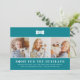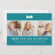 La carte de Noël de notre chien de compagnie "Maison pour les fêtes" présente un collage de trois photos carrés de votre nouveau chiot à partager avec vos amis et votre famille. Personnalisez le texte avec un message d'accueil personnalisé, votre nom de famille, le nom de votre chiot et l'année. Le design moderne en bleu turquoise comprend un empreinte de patte mignon, un os de chien, et un motif de coordination en vichy / buffle plaid sur le dos.