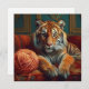 Image générée par l'IA d'un Tigre allongé sur un canapé rouge, avec une grosse boule de fil.