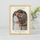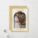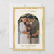 Retro Gold Plaid et Arch Photo Christmas Happy Holiday Card. Célébrez la saison avec élégance grâce à cette carte de Noël en plastique avec une bordure en vichy en faux or et un cadre photo moderne en forme d'arc. Personnalisez-le avec votre photo de famille préférée, avec des textes modèles "Joyeux Vacances", nom de famille, et l'année sur arrière - plan beige blanc ou crème. Le design festif est mis en valeur par une élégante typographie Happy Holidays couleur faux or, créant un look chaleureux et intemporel. Le dos présente un motif en vichy jaune doré assorti pour une finition coordonnée et polie. Une carte de vacances parfaite à partager en famille et entre amis en hiver.