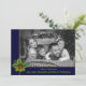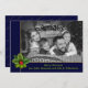 Votre photo en couleur sera automatiquement convertie en une image en noir et blanc élégant lors de son téléchargement dans cette conception moderne de carte photo de Noël propre. Votre photo de famille remplissant le visage de la carte derrière un cadre bleu et or surligné d'une pince de pin et de houx. Le groupe inférieur tient vos noms et salutation de Noël dans une police verte douce. Or pétillant Joyeux motif de Noël sur le dos contre un bleu foncé de Noël.
