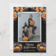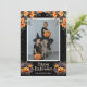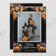 Photo personnalisée Carte d'Halloween avec une photo ornée d'un jack-o-lanternes d'aquarelle en casquette noir, fleurs violettes et oranges et verdure. Personnalisez facilement cette jolie carte d'Halloween avec votre photo et le nom de famille. Cette carte photo Halloween peut être transformée en n'importe quelle couleur à l'aide de l'outil de personnalisation.