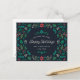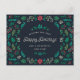 Cette conception présente une couronne festive faite de houx, de baies et de feuillages d'hiver variés. Le vert audacieux et les accents rouges ressortent sur un fond sombre, entourant un message chaleureux de joie des fêtes et de vœux pour une excellente année nouvelle.
