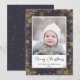 Script moderne Blue élégant Snowflakes Bokeh Minimalist Holiday Card. Envoyez des salutations de vacances personnalisables et personnalisées à vos amis, vos collègues et votre famille en cartes photos simples, minimalistes, élégants, amusants, festifs et modernes ! Un beau cadre de variété de flocons d'hiver dorés sur arrière - plan vert sauge entoure votre photo. Le message de bienvenue "Joyeux Noël" est écrit en calligraphie élégante, et ci-dessous présente votre message de bienvenue personnalisé de votre nom de famille dans la typographie moderne. Reverse pour révéler une belle les flocons de neige d'hiver d'or complet sur l'arrière - plan motif vert sauge.