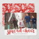 Ce carte photo de vacances d'amusement comporte la police marquée avec des lettres par main rouge d'aquarelle sur un arrière - plan blanc croquant. Le postérieur inclut une texture rouge coordonnée d'aquarelle avec des baies et des branches de vacances.