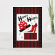 Cette carte de vacances est pour tous ceux qui aiment les chaussures et les bottes. Une chaussure rouge funky avec un talon très haut, des clous et une chaîne sort d'une boîte à cadeaux rayée rouge et noir. Le dessus de la boîte cadeau est sur un angle et il a un grand arc rouge. "Joyeuses fêtes !" est au sommet. Des étoiles et des rayures décorent la bordure noire. "À un vrai fashionista" est le texte intérieur. Idéal pour les cartes de voeux et les cartes de notes. Il y a de la place pour un message personnel. Cette carte est mignonne, moderne et funky.