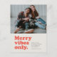 Joyeuses vibes seulement cette saison des fêtes ! Envoyez une carte de vacances amusante de style rétro avec ce design photo unique. Le type de retour en arrière dit "joyeuses vibes seulement" et il a également de la place pour un message personnalisé, nom et année. L'arrière dispose d'espace pour un message personnalisé mais peut être laissé vide pour que vous puissiez écrire un message plus personnel.