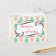 Une carte postale festive avec un mignon motif de noël. Un arrière - plan de couleur crème avec des illustrations d'un arbre de noël vert pastel et bleu pastel et une baule rose pastel avec un ruban dans un motif extensible. Au centre se trouve un cadre lunaire dessiné à la main avec de mignons tourbillons. Dans le cadre le texte dit : Joyeux Noël & Bonne Année. À l'arrière, il y a un message de Noël que vous pouvez laisser tel quel ou changer selon vos besoins. Personnalisez avec votre adresse et votre nom de retour. Ce design aux couleurs pastel lui donne une agréable allure rétro.