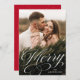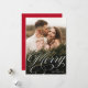 Elégante carte de vacances avec votre photo verticale avec "Joyeux" affichée dans une superposition de script de calligraphie blanche. Personnalisez l'avant de la carte de vacances de script de calligraphie en ajoutant votre nom ci-dessous. Le carte photo de vacances revient à un subtil motif de neige blanche avec un arrière - plan rouge (ou la couleur de votre choix).