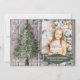 Joliment décoré, il comprend un pin avec des cônes de pin et un cardinal rouge. Le pin est contre un arrière - plan de bois rustique. Autour de l'arbre, il y a du texte dans différents styles de polices blanches qui disent différents mots de la saison tels que la joie, le bruit, les nouvelles, la foi, etc. À droite du pin est un endroit pour ajouter votre photo. En dessous de la photo est une bannière gris-vert où vous pouvez customiser avec votre propre texte en police blanche. L'envers de la carte a l'arrière - plan rustique en bois. Il fait partie de la collection Pine Tree With Cardinal Rustic Christmas.