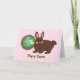 Carte Pâques mignonne avec un nid d'oeufs colorés sur un lit de paille verte. Un lapin de couleur chocolat les garde.