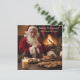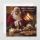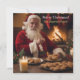 Carte de Noël personnalisée avec Père Noël assis dans un salon avec une belle cheminée et un arbre de Noël, mangeant les biscuits laissés par les enfants. Ce design a été créé par Debbie Quick de Debs Creative Images : www.debscreativeimages.com