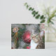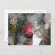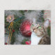 Chat tabby Brown avec des marques blanches devant une carte postale de Noël décorée